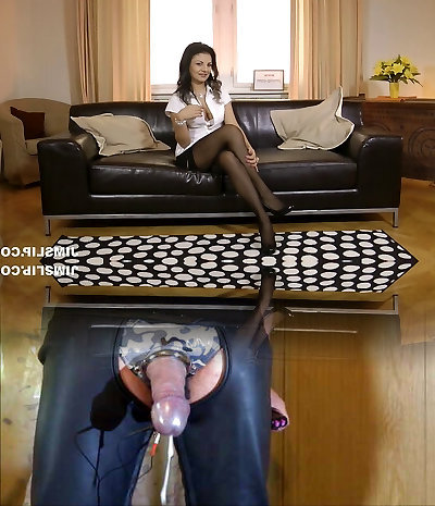 Boss ladyboy in high-heeled shoes and pantyhose shows off beautiful feet and cock