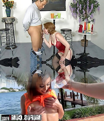 Lingerie-clad cougar with massive fake boobies sucking a big black cock