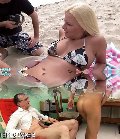 Sexy bootyful brunette bathing suit female Cassie rides cock mad on the beach