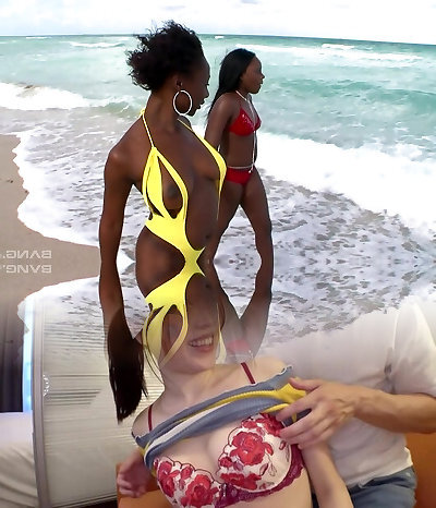 Katrina Moreno romped on a beach by a couple of fellows