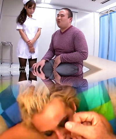 Yui Tatsumi pretty Asian nurse in white stockings sucks stiffy