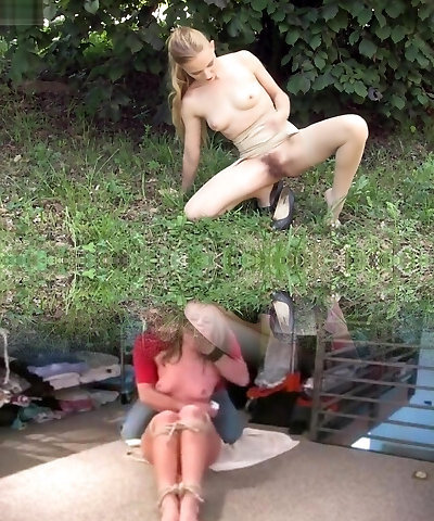 Kinky latex mistresses investigate pussy of one plum chick outdoor